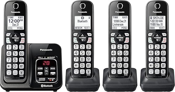 Panasonic Expandable Cordless Phone System with Link2Cell Bluetooth, Voice Assistant, Answering Machine and Call Blocking - 4 Cordless Handsets - KX-TGD664M (Metallic Black)